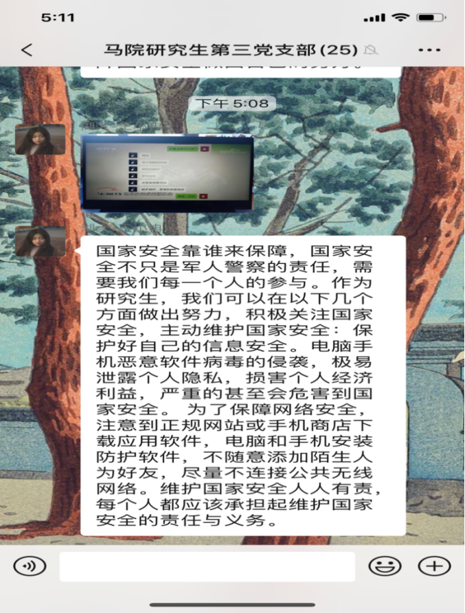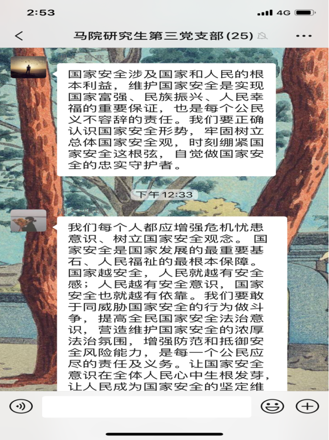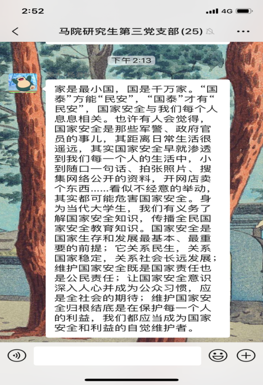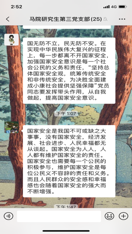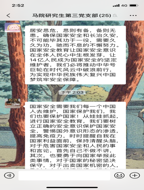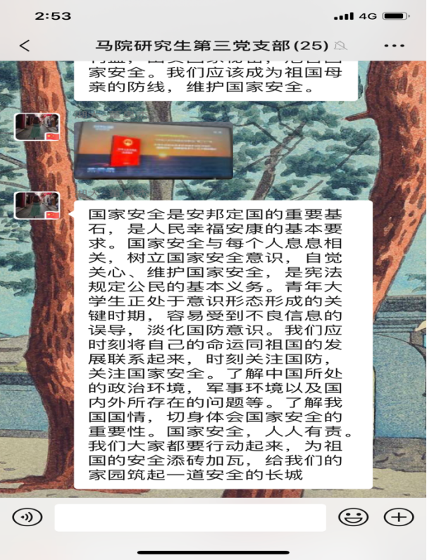 研究生第三党支部开展4月份主题党日活动,全体党员同志观看《汇聚人民力量 维护国家安全》专题片。在观看后,同志们感触颇多,纷纷在支部微信群分享观后感。