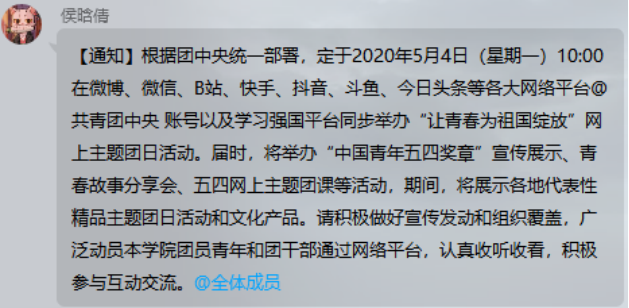 本科生党支部于2020年5月4日通过观看网上直播的形式开展“让青春为祖国绽放”线上主题党日活动。
