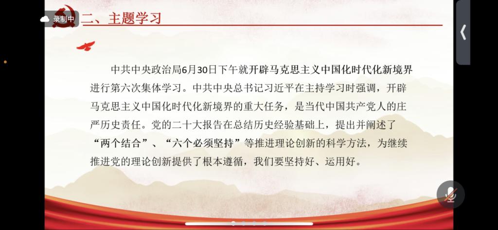 会议最后,武子昂同志进行了学习发言,她表示,自己对习近平总书记在中央政治局第六次集体学习时的重要讲话精神有了更加深刻的认识,也深刻领悟到全面从严治党永远在路上。路子歆同志在学习发言中指出:“回顾党的百年奋斗史,党始终掌握马克思主义科学理论,并结合时代发展进行理论创新。我们青年党员也要贯彻其科学理论,以自己所学推动理论创新。”