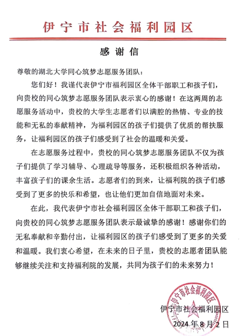 信中指出,本次社会实践活动共吸引来自24个省市183所高校的392支团队奔赴天山南北的田间地头、城镇社区、企业工厂 开展社会实践,将“读万卷书”与“行万里路”相结合的“大思政课”中受教育、长才干、作贡献。在此次社会实践活动中,瓜子tv “星火接力,同心筑梦”实践团队用无私奉献诠释了新时代青年的责任与担当,助力铸牢中华民族共同体意识教育,对此致以衷心的感谢。