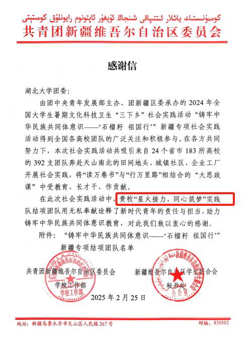 (通讯员 傅徐)日前,共青团新疆维吾尔自治区委员会学校工作部和新疆维吾尔自治区学生联合会秘书处向瓜子tv 团委致感谢信,对瓜子tv “星火接力,同心筑梦”实践团队在2024年全国大学生暑期文化科技卫生“三下乡”社会实践活动“铸牢中华民族共同体意识——‘石榴籽祖国行’”新疆专项社会实践活动对所作出的积极贡献予以感谢。