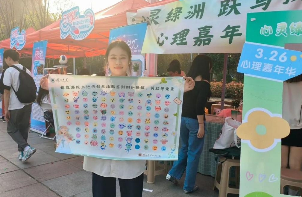 手作体验区人头攒动,香包制作摊位上,学生们细心穿针引线,将艾草与祝福融入精致的香囊之中;漆扇绘制摊位上,洁白的扇面经过五彩漆料的渲染,美轮美奂,引得旁观众人连连赞叹……此外,现场还设置了心理知识科普展板,以通俗易懂的方式介绍心理问题的应对策略与情绪管理技巧,让同学们在欢愉中收获了实用的心理知识。