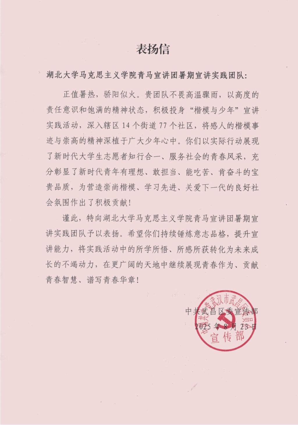 青马宣讲团收到中共武昌区委宣传部发来的表彰信,对其在武昌区“楷模与少年”宣讲实践活动中的表现和成效予以高度肯定。