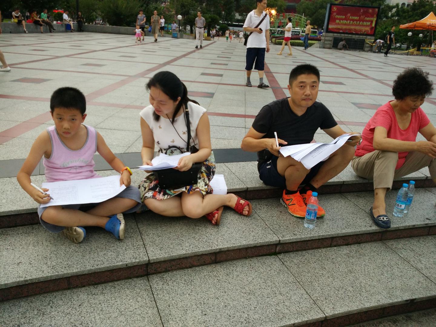 西陵社区位于宜昌市繁华闹市,由于社区广场上休闲人数较多,我们立即兵分三路,尽可能保证在天黑之前完成更多的有效调查问卷。西陵社区的居民不仅热情而且积极配合我们的工作,有的居民直接蹲在地上一笔一划填写我们的调查问卷,有的学生主动找我们要调查问卷填写,虽然他们可能不太了解社区文化的真正内涵,可是他们饱满的热情深深地感染了我们,也让我们对宜昌市西陵社区的文化建设有了全新的体悟。