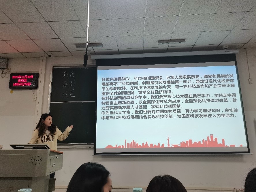 同学们在曾馨同学的共同组织之下观看视频,重温有关中国科学技术发展的激动瞬间,进一步了解新中国建立以来几位科学界做出过卓越贡献的科学家。此外,曾馨同学还为大家介绍了十九届六中全会的相关内容,党的百年奋斗重大成就和历史经验深入同学们心中。