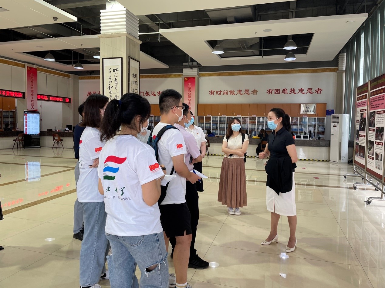 调研团队成员与百步亭社区党委副书记王波、百步亭妇联常务副主任庞国云,百步亭悦秀苑党支部书记田欢、百步亭宣传部部长李珊举行座谈会。王波书记向大家介绍了百步亭社区在党的建设、居民自治方面的创新与经验,并指出了“红色物业”在社区治理中发挥的积极作用,建议推动“红色物业”融入社区治理实践中。