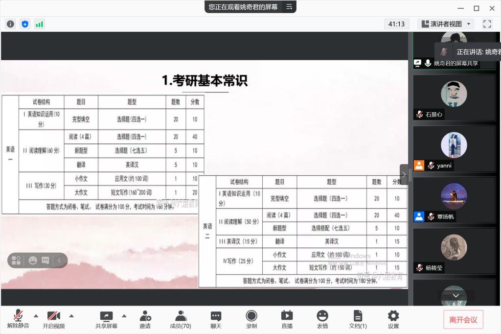 812日晚9点,瓜子tv 举行2019级思政专业考研考公分享会,邀请2017级艾斯卡尔和姚奇君两位学长分别就考公和考研进行经验分享,其中艾斯卡尔学长已考取咸宁市发改委选调生,姚奇君学长已考取中共中央党校(国家行政瓜子tv )研究生,院党委副书记、2019级思政班班主任晏妮老师以及思政1901班全体同学参加。
