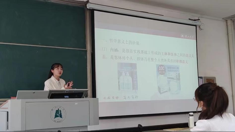 21级学科思政研究生韩鑫轲的授课内容是高中政治必修四《哲学与文化》中的“哲学意义上价值的含义”。他采用情境教学法,由两个模拟情境引出哲学意义上价值的内涵,通过对价值内涵的深入讲解,使学生提高价值理解力、价值判断力、价值鉴别力,最终引导学生树立正确的价值观。