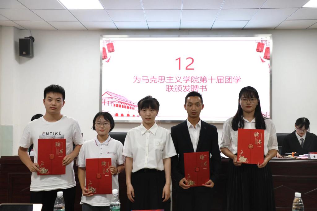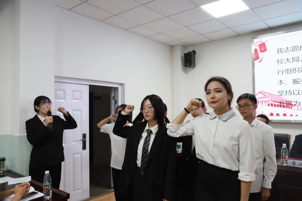 大会对当选同学表示热烈祝贺,院团委负责人孙倩为上一届学生会主席团成员颁发聘书,第十二届主席团成员和第一届委员会委员宣誓就职。