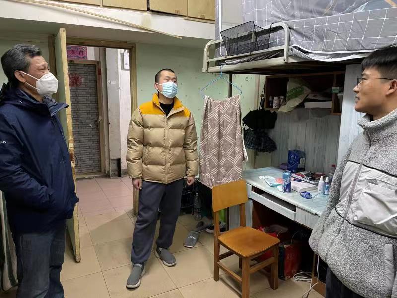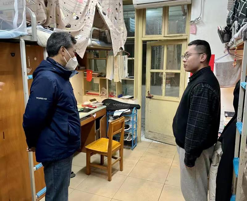 老师与学生亲切交流,检查学生宿舍安全卫生情况,提醒学生食品安全、防火、防盗、防电信网络欺诈等注意事项,同时,强调学生要坚持科学佩戴口罩、勤洗手等良好卫生习惯,加强身体锻炼,保持健康生活方式,在完成学业任务的同时提升健康素养和自我防护能力。