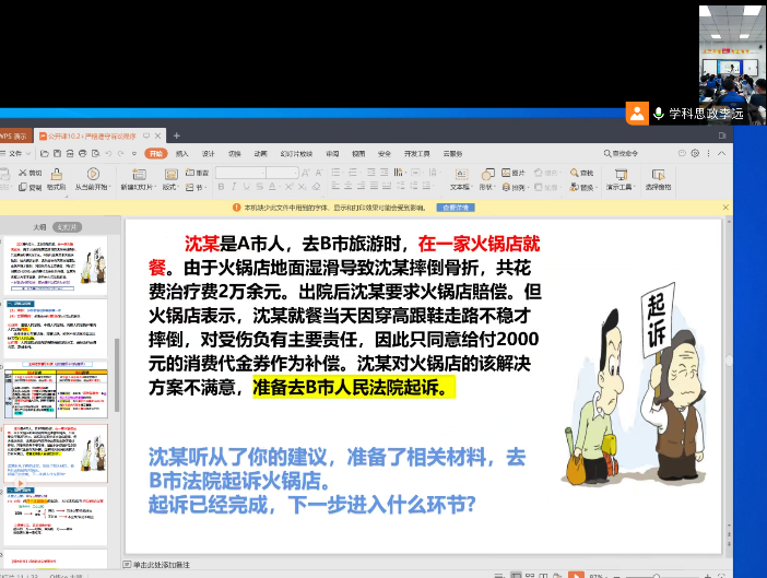 5月16日16:30,2021级学科教学(思政)李远主讲高中选择性必修2 《法律与生活》第四单元第十课第二框《严格遵守诉讼程序》。课堂中设置了模拟法庭这一教学环节,生动有趣,过程中学生们都积极参与,学生既可以知道诉讼的基本程序,同时感受到了模拟法庭带来的快乐,甚至为以后职业的选择提供一些建议,课堂反映良好。