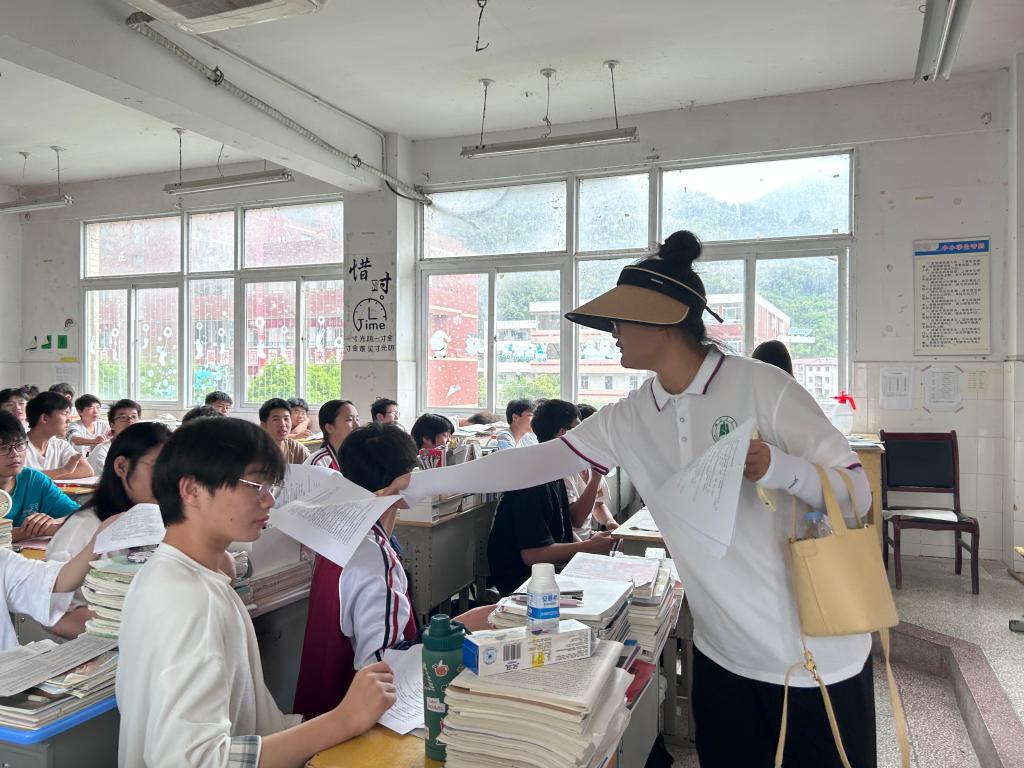 (图为实践队小组成员在金寨县青山中学某班级发放问卷 通讯员 周翔 供图)