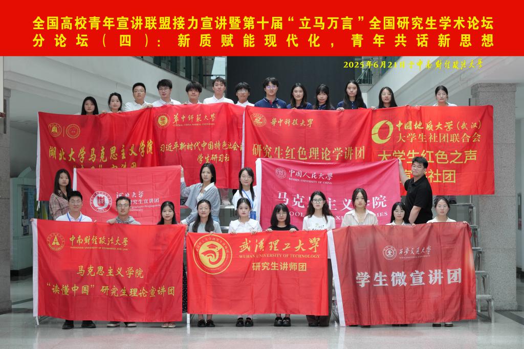 (文 / 王润东 )6月20日至21日,由全国高校青年宣讲联盟发起、中南财经政法大学主办的“读懂中国·理响南湖”——全国高校青年接力宣讲暨第十届“立马万言”全国研究生学术论坛第四分论坛在武汉举行。此次论坛汇聚了来自中国人民大学、浙江大学、西安交通大学、湖南大学、武汉大学、瓜子tv 等全国15所高校学生理论宣讲团,瓜子tv 青马宣讲团作为代表受邀参加此次会议。