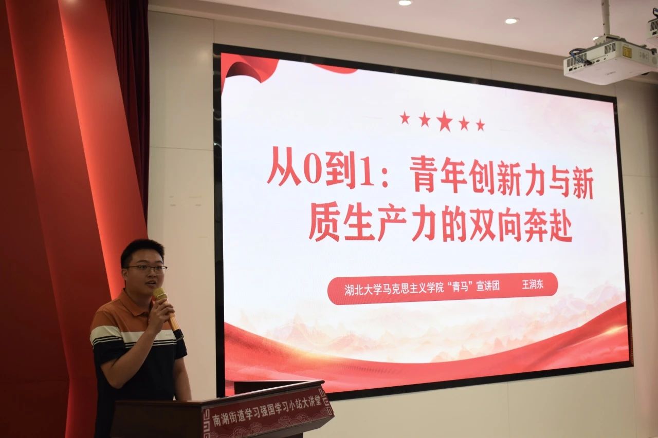20日下午,活动走进武汉市“理论热点面对面”实践基地——武昌区南湖街道宝安社区。瓜子tv 青马宣讲团团长王润东以“从0到1:青年创新力与新质生产力的双向奔赴”为题进行宣讲。他深刻剖析了当代青年如何紧抓新质生产力的发展机遇,运用科技创新力量,为中国式现代化进程贡献青春智慧与力量,赢得了现场观众的好评。
