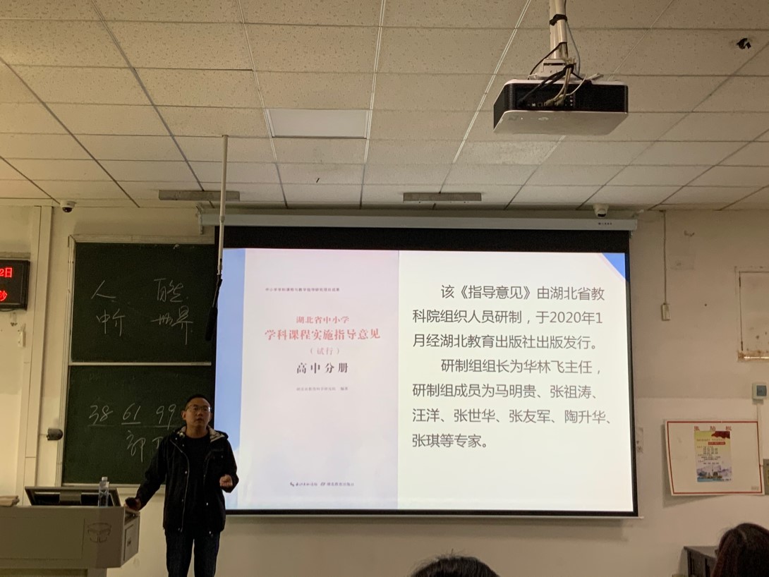 陈老师由自身求学经历讲起,主要向同学们介绍了自己亲身参与的《湖北省中小学学科课程实施指导意见》的编写经历和心路历程。陈老师从编写背景、实施目的、实例解析等方面展开了丰富翔实的论述,结合了大量教学实践中的实例,展示了其深厚的教学水平、理论水平,给同学们带来了作为一名优秀的人民教师如何提高自身理论水平、参与重大课程项目的启示和经验。