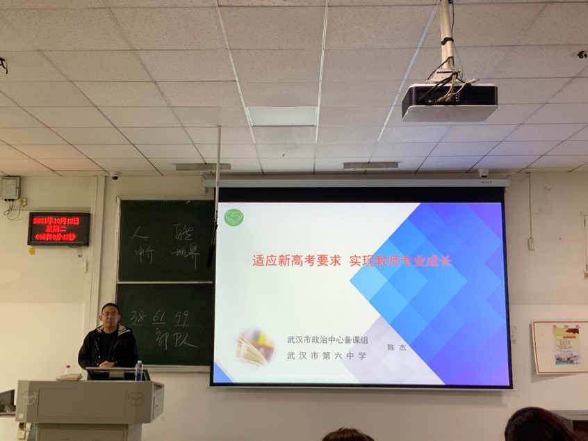 首先胡银银老师简明扼要的为在场的同学们介绍了陈杰老师。陈老师多次参与省、市教师技能大赛,现任武汉市政治中心备课组成员、武汉市第六中学政治课负责人之一。