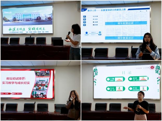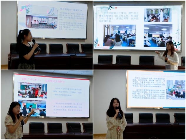 会议伊始,胡银银老师对顺利完成实习工作的各小组表达了祝贺。随后,2022级17个实习小组代表依次上台汇报实习成果:“让花成花,让树成树”从萌芽到生长再到开花,小小的种子在心中逐渐成长;“我在中学当老师”以实习生的视角展开对一天工作的介绍,凝结着教师的使命担当;“播撒‘同心种’”一堂特殊班会课的开展,让学生在民族团结中领会独特的文化魅力;“与四美塘相yu”以“遇师、育人、愉行、寓教、愈己”为线索,分享从学生转向教师的成长经验……这些不同的汇报主题凝聚着同学们在实习过程中的独特体验,体现着他们的成长与收获。
