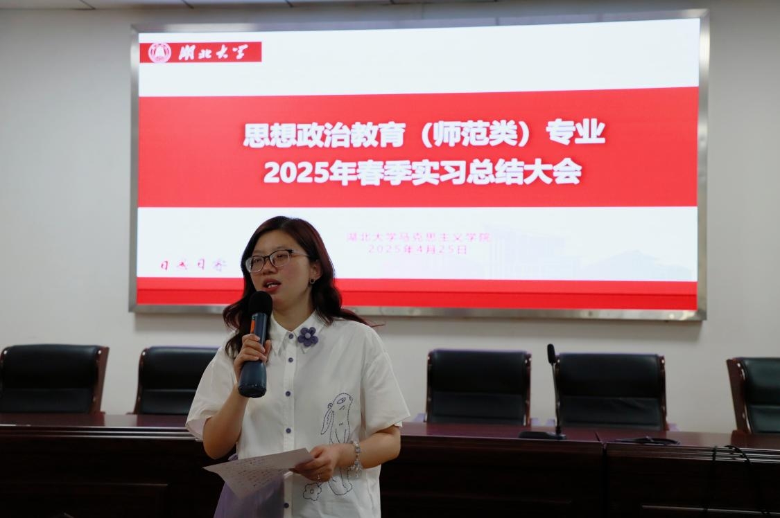 (通讯员:张万欣)4月25日上午九点,2025年度春季实习总结大会于2号教学楼410报告厅举行,会议由政教系主任胡银银老师主持,教学副院长徐信华、部分实习指导教师及全体2022级思想政治教育本科生参与会议。