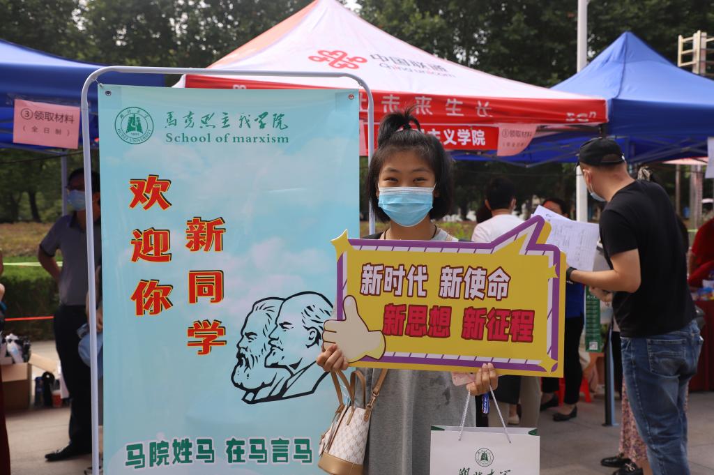 在帐篷旁设置打卡处,新生手持“马院姓马,在马言马”、“有高度、有态度、有温度”、“新时代新使命、新思想新征程”等手持牌拍照留念,留下初到湖大时的美好瞬间。新生们按照流程完成报到手续后,在志愿者的帮助引导下前往宿舍办理入住手续。
