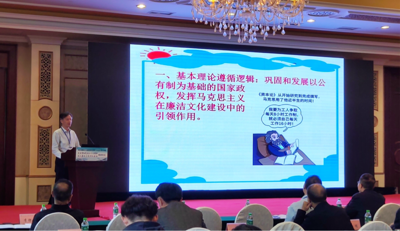 会前,徐方平教授和蒋英文老师合作向大会提交了论文。21日下午。徐教授以“推进廉洁文化建设理路的四维逻辑探赜”为题作了大会交流发言。他从基本理论遵循逻辑、历史传承旨要逻辑、时代要求指向逻辑和实践进路向度逻辑四个维度,对推进廉洁文化建设的理路进行了深入分析。