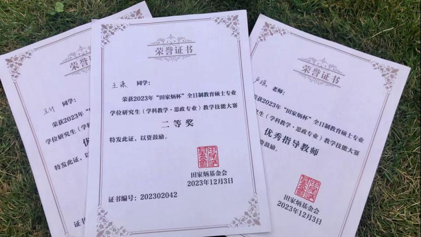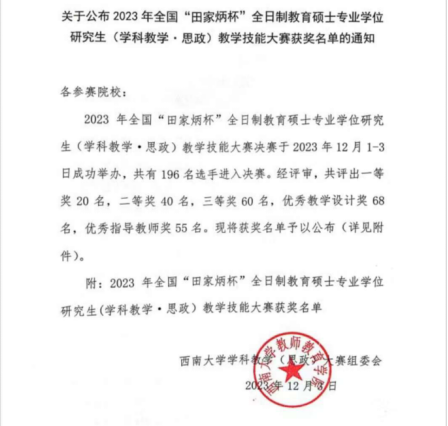 2021级学科教学(思政)研究生王潇同学最终斩获决赛二等奖、2022级学科教学(思政)研究生王什同学荣获决赛优秀教学设计奖,卢瑶老师获优秀指导教师奖。