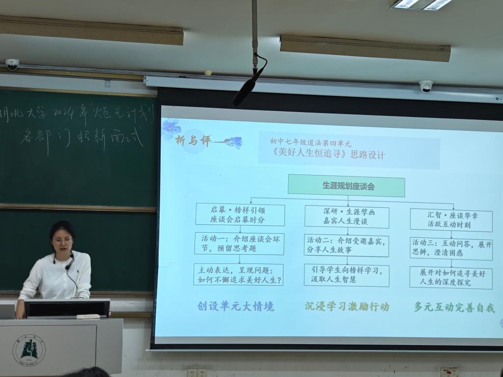 在第一环节中,赵老师重点介绍了“时政述评”的活动,提出在此活动中,教师应当引导学生把握时代主题,联系生活实践,将个人“小我”和国家“大我”紧密结合,促进学生的自我肯定和积极成长。她强调,整合时政热点,把握时代脉搏,是思政课教学的重要生命线,教师应当积极探索将党和国家的重大热点问题融入课堂教学的路径。