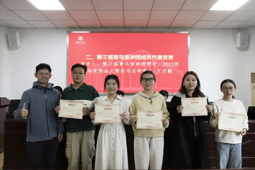 会议伊始,第三届青马宣讲团团长、2023级马克思主义理论专业研究生王贞懿围绕“暖心、用心、信心”三心,对过去一年青马宣讲团的工作进行了回顾和总结,讲述了自己在青马宣讲团的收获与感悟,同时表达了对指导老师和共同努力的工作伙伴的感激之情,并对青马宣讲团的未来寄予希望。